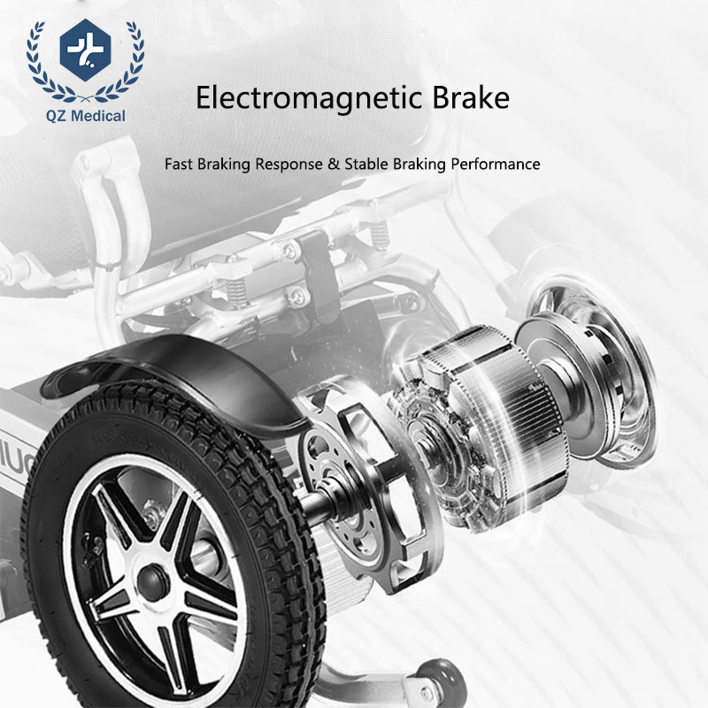 A: Yes. It features an electromagnetic braking system that automatically stops the wheelchair when the control is released or power is interrupted.