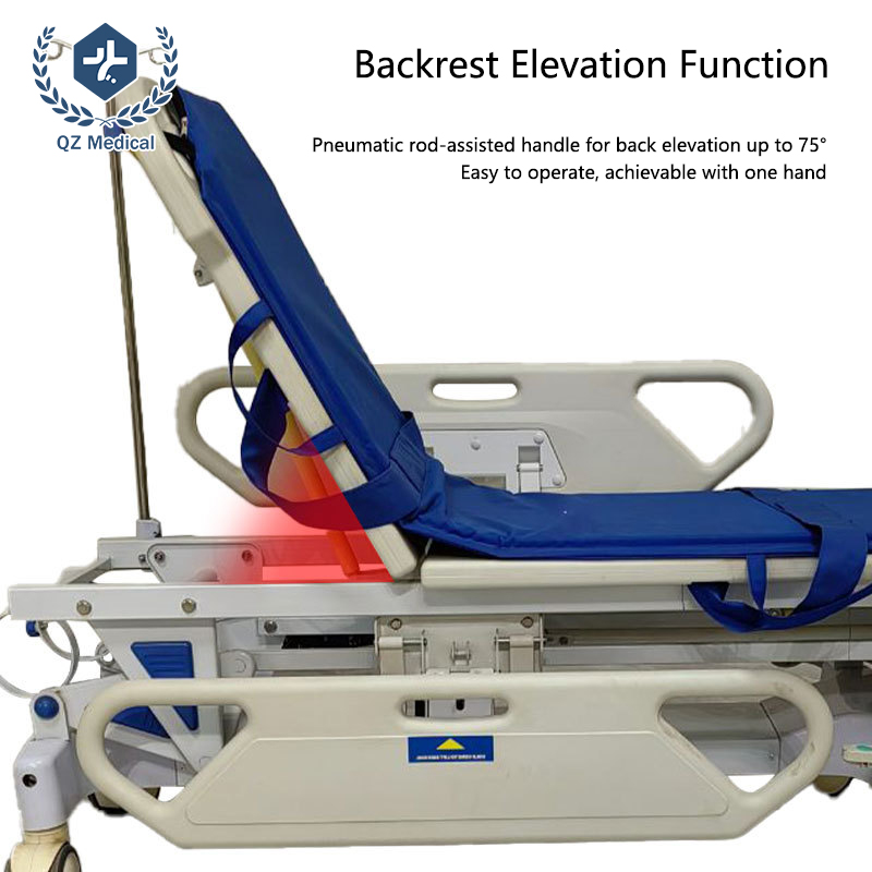 The stretcher supports overall height adjustment from 550 mm to 900 mm, allowing caregivers to match different bed heights and reduce physical strain during transfer.