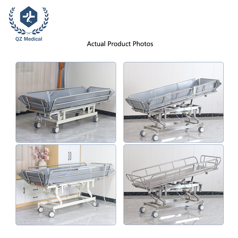 In hospital environments, this nursing bathing bed offers reliable support for patients requiring regular bathing assistance. The stainless steel construction ensures durability in high-use settings, while the waterproof mattress and drainage system maintain a clean and hygienic environment, reducing the risk of infections. The back tilt function allows medical staff to position patients comfortably for bathing, and the height adjustment feature makes it easier for staff to assist patients without straining their backs. The foldable safety rails provide an added layer of security during bathing procedures, making this bed an essential piece of equipment in hospital and nursing home settings.