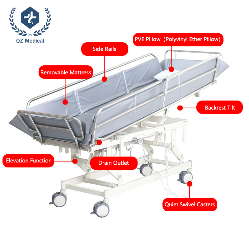 This multi-functional nursing bathing bed eliminates the need for multiple pieces of equipment, offering a comprehensive bathing solution in one unit. The height adjustment feature allows the bed to be raised or lowered to the optimal position for both caregivers and patients, reducing back strain during bathing. The waterproof PVC mattress is easily removable for cleaning and prevents bacterial growth, ensuring a hygienic bathing environment. The back tilt function provides comfortable positioning for patients during bathing, while the PVE head pillow with drainage system prevents water from entering the patient's head, making the bathing process smooth and worry-free.