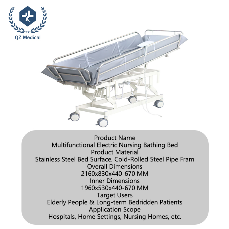 For rehabilitation centers, this multi-functional nursing bathing bed provides a valuable tool for patient care. The back tilt function can be adjusted to specific angles for therapeutic positioning during bathing, aiding in the recovery process. The waterproof mattress and drainage system ensure that the bed remains clean and hygienic after each use, which is critical in rehabilitation settings. The foldable safety rails allow for easy patient access during bathing, and the height adjustment feature ensures that therapists can work at a comfortable level, reducing strain on their own bodies while providing quality care.
